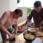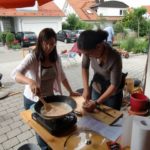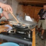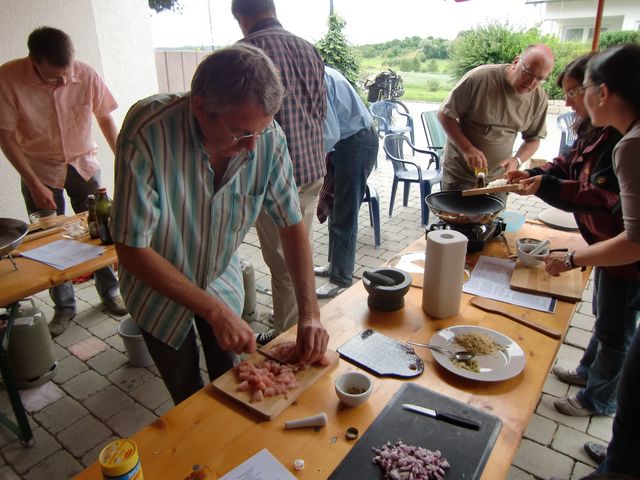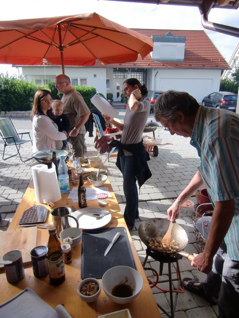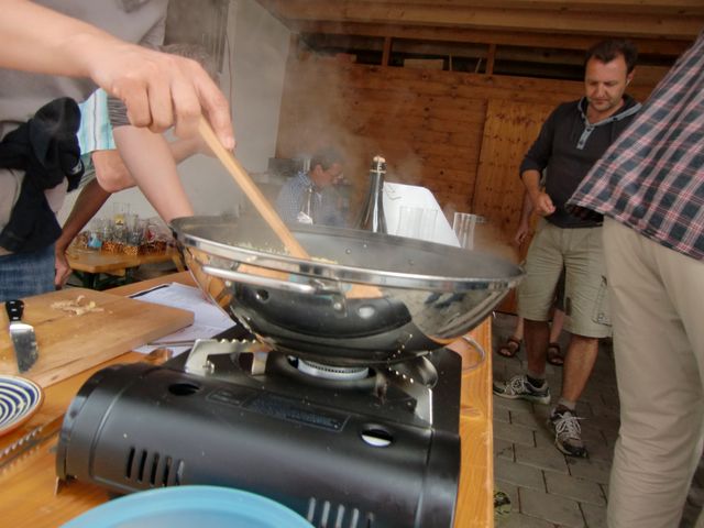 Das schlechte Wetter hat uns nicht abgeschreckt, den Kochkurs im Freien statt finden zu lassen. Allerdings mussten wir den Ort kurzfristig verlegen. Anstatt auf der schönen Obstbaumwiese packten wir in diesem Jahr unsere WOK’s und Gasbrenner in der Hohenenneuffenstraße aus.