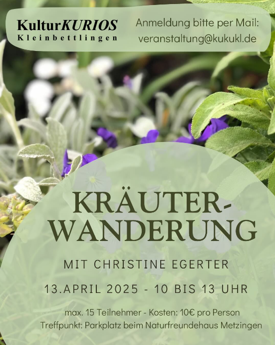 Am 13.04. von 10:00 bis 13:00 erwandern wir die heimischen Kräuter unter professioneller Führung. Start ist beim Naturfreundehaus Metzingen.