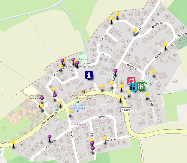 Auf der Karte sind die Künstler mit lila Pins und die Garagenflohmärkte mit gelben Pins markiert. Hier findet sich ein digitaler Lageplan! und weiter unten die Liste der Künstler:innen und die Adressen der Garagenflohmärkte.
