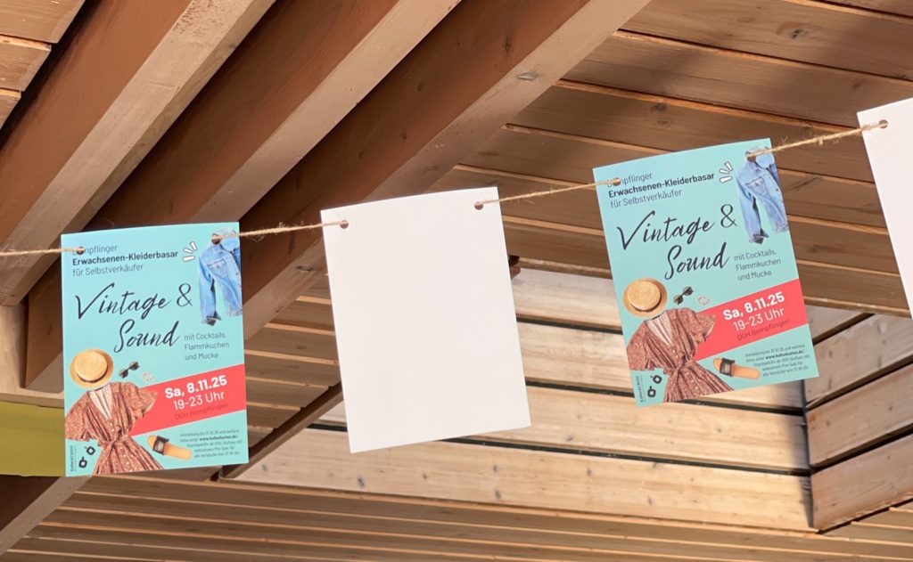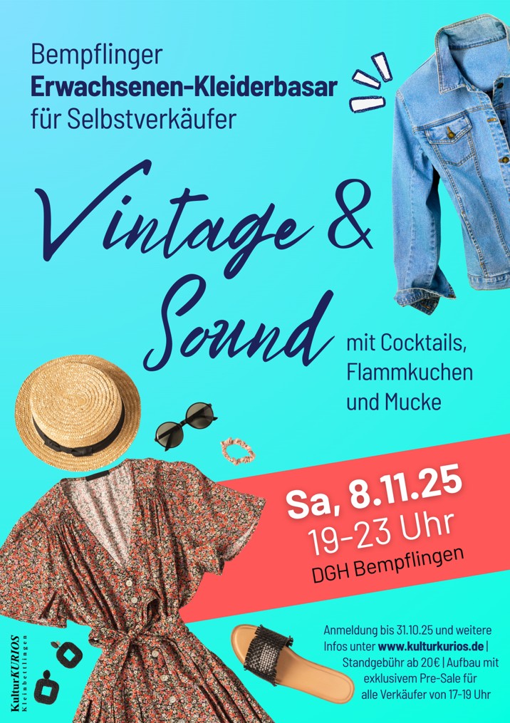 Am Samstag, 8.11.2025, 19–23 Uhr verwandeln wir das Dorfgemeinschaftshaus (DGH) Bempflingen in einen stimmungsvollen Abend-Kleiderbasar – mit Cocktails, Flammkuchen und Mucke. Verkäufer sind private Selbstverkäufer (kein gewerblicher Verkauf).